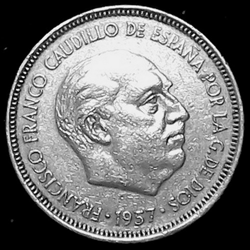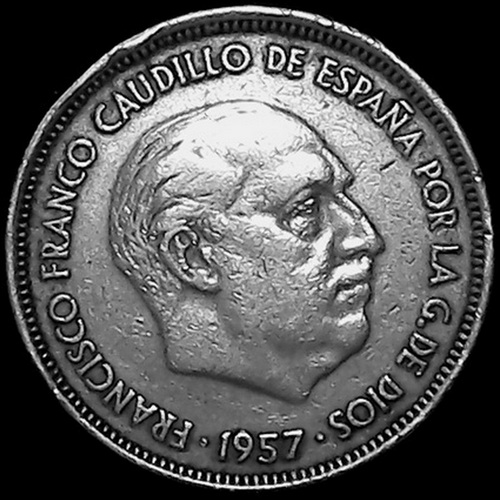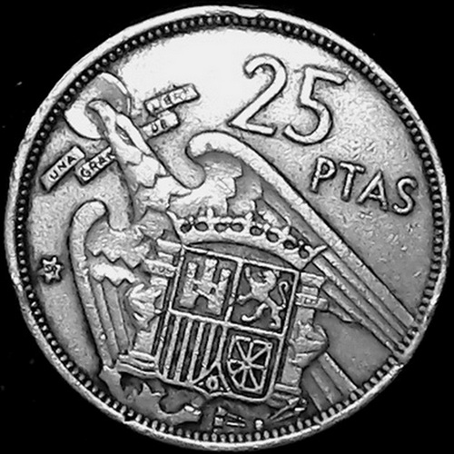 La moneda 25 pesetas del 1957 pertenece al catálogo de monedas de España. En la siguiente ficha encontrarás las principales características numismáticas de esta moneda: ceca, año de acuñación, diámetro, tirada, peso, material de fabricación y tipo de canto.
