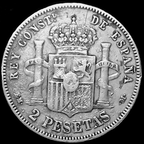Peso: 10 gr. Medida: 27 mm. Anverso: ALFONSO XII POR LA GRACIA DE DIOS * 1879 * alrededor de un busto del rey con barba a izquierdas. Reverso: REY CONSTL. DE ESPAÑA EM 2 PESETAS M alrededor de un escudo coronado de España.